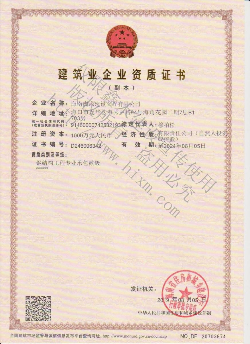 公司成立于2002年12月 ,具有钢结构专业二级资质和膜结构设计施工专业资质,在海南平稳发展运营18年之久,是集设计、制造、安装于一体的大型钢结构、膜结构及各种非标机械设备的专业生产型企业。承揽了岛内外各种高端复杂的轻钢结构、钢网架结构、张拉膜结构以及各种非标机械设备的设计、制作和安装工程。也承接配套的土建工程、水电工程、玻璃幕墙工程、铝塑工程的施工以及相关电子产品委托代理加工、安装,钢结构辅助材料的供应。 多年来受到各界表彰及荣获多种荣誉称号。在此就不一一列举。
